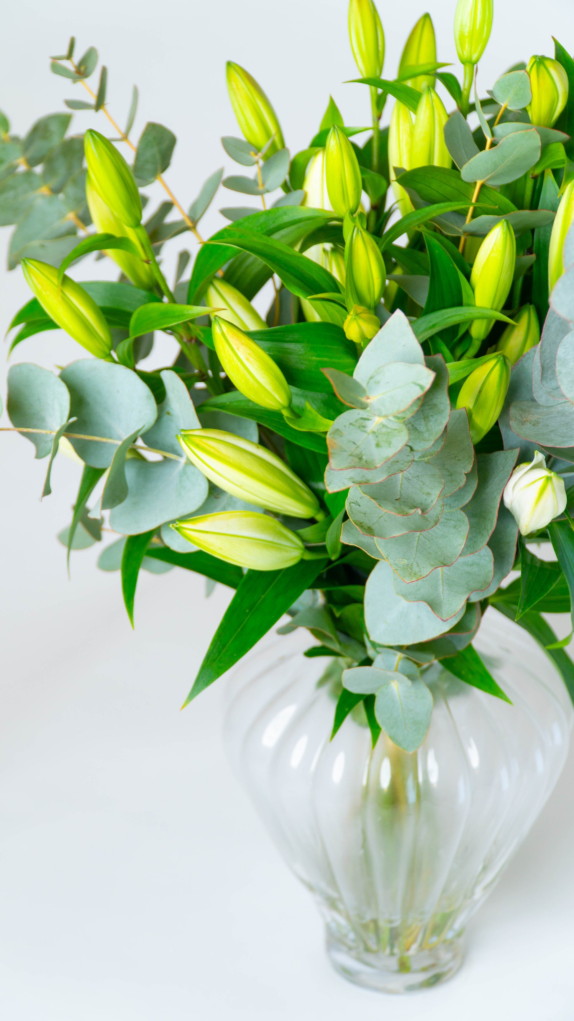 Elegant buket i hvide og grønne toner – tidløs og sofistikeret, perfekt til enhver anledning.